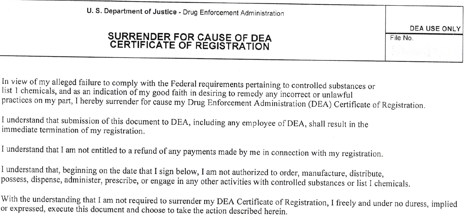 They tell you it’s a “voluntary surrender” of your DEA registration, suggesting it will “make things easier” or “avoid complications.” The pressure is immediate. Signing feels like the simplest way out of a stressful situation.